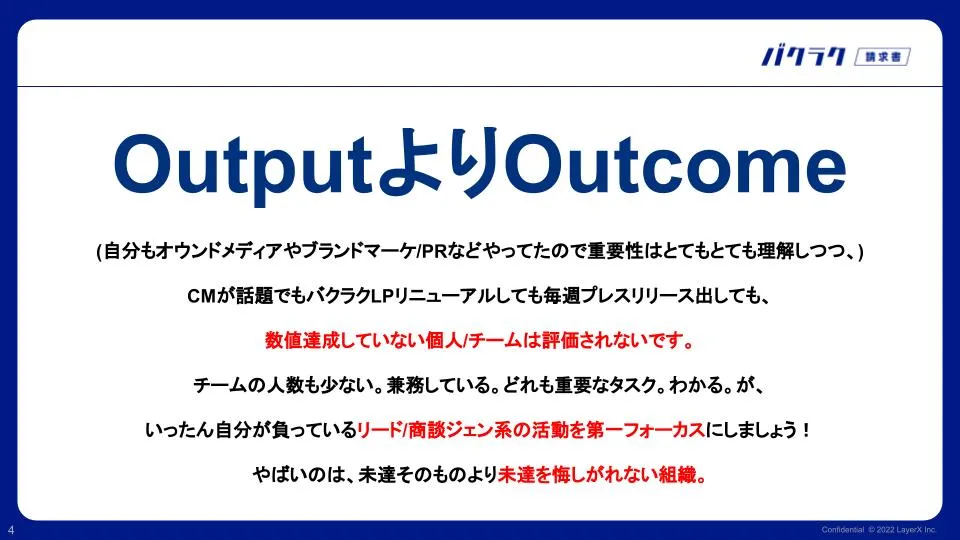 自分自身も入社してからというもの採用サイト / バクラクリニューアル / TV CMと大型のPJを着地させることにリソースが向きすぎていたため、2月はあえて**「出しただけのものは評価しません」**と言い切り、”OutputよりOutcome”を標語として目先の数値達成とそのためのPDCAにチームのフォーカスを向けました。