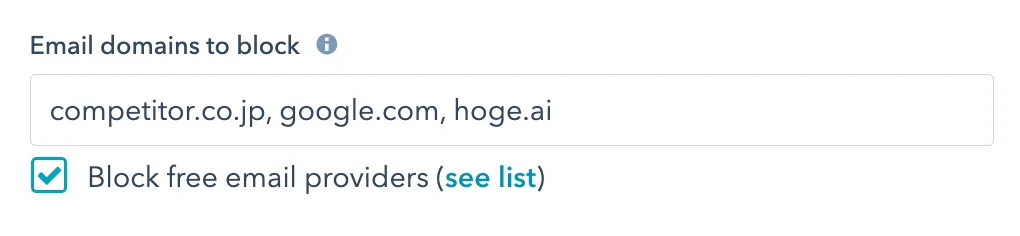 Emailのプロパティにコンバージョンを阻止したいドメインを直接入力することでフォーム入力自体を防ぐことができます。